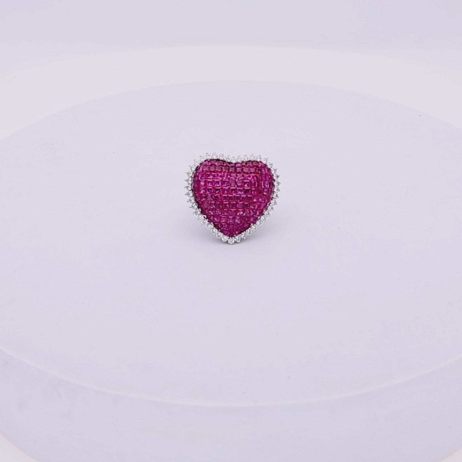 Introducing the Aurelyn Ember Ring, a stunning masterpiece that personifies elegance and passion. This exquisite ring features a heart-shaped design, meticulously encrusted with vibrant pink gemstones that radiate with a fiery brilliance. The central motif is surrounded by a halo of dazzling clear stones, adding a touch of sophistication and sparkle.