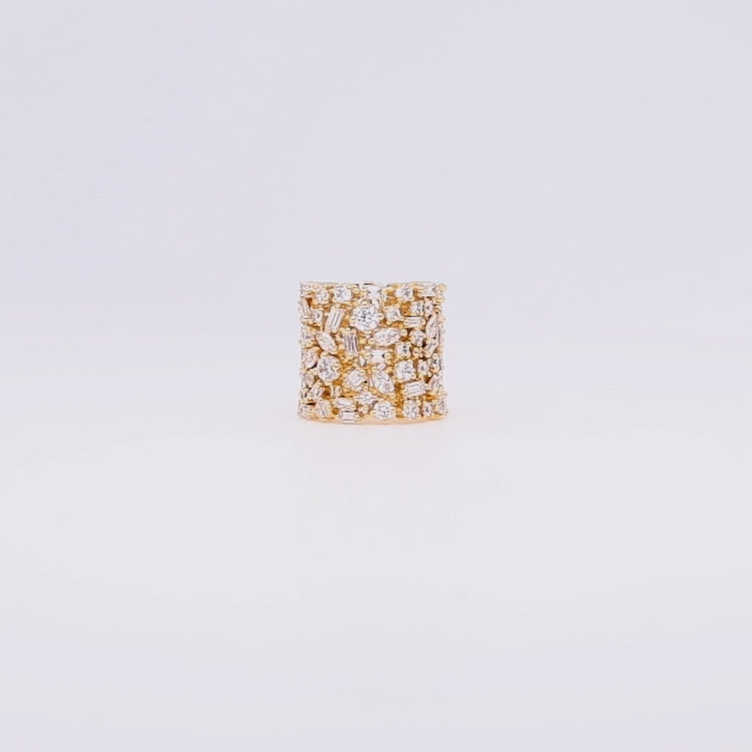 Introducing the Aurelyn Frost Ring, a stunning embodiment of elegance and sophistication. This exquisite piece is crafted in radiant gold, its wide band lavishly adorned with a breathtaking array of shimmering gemstones. The intricate design showcases a mesmerizing pattern of round, marquise, and baguette-cut stones, each expertly set to capture and reflect light brilliantly. The harmonious blend of geometric shapes creates a dazzling tapestry, exuding luxury and grace.