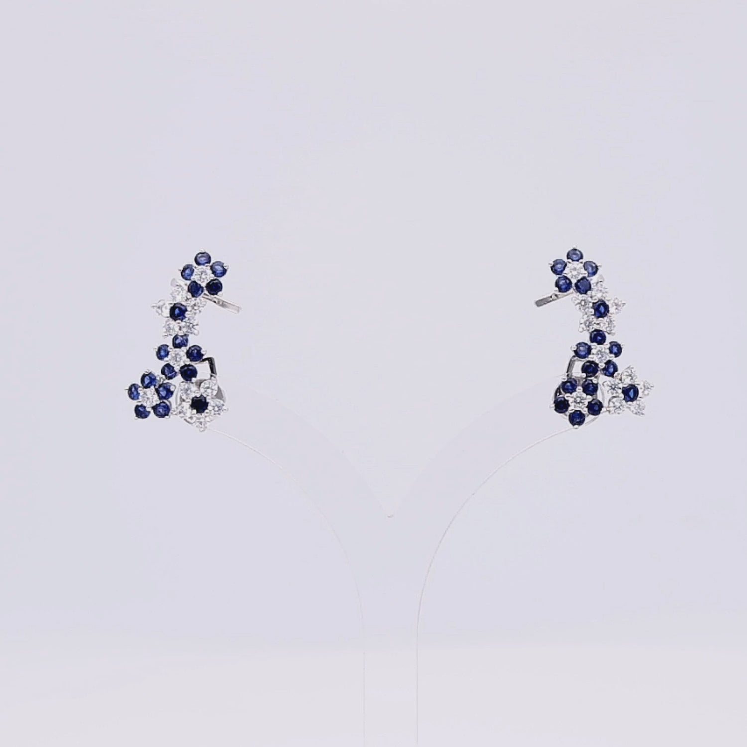 Introducing the Azuris Whisper Earrings, a stunning embodiment of elegance and sophistication. These earrings feature a captivating design of clustered floral motifs, crafted with meticulous attention to detail. Each earring is adorned with a dazzling array of deep blue sapphires, their rich hues beautifully complemented by the sparkling brilliance of clear gemstones.